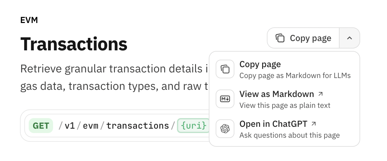 To help AI tools understand our API structure, we provide OpenAPI specifications for each of our endpoints. These files detail available parameters, request bodies, and response schemas, making them ideal for generating client code or for use in custom AI agents. You can find our OpenAPI specifications in the following directories:- EVM API specifications: