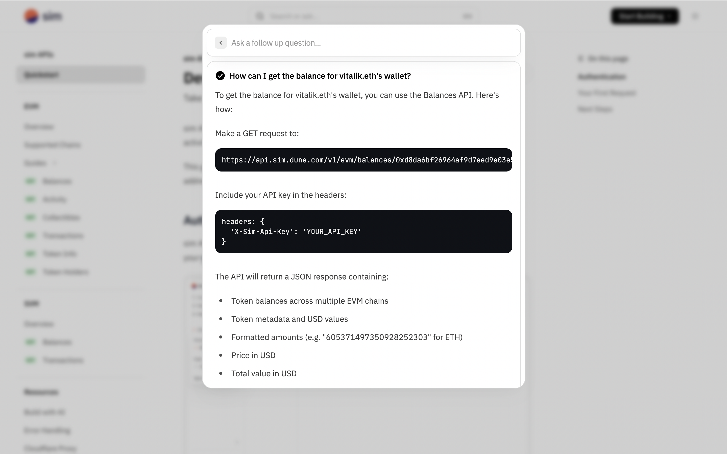 To ask questions about our documentation, click the Ask AI button in the header of the site. This opens a chat interface, powered by Mintlify, that understands natural language queries. Ask questions about endpoints, authentication, or specific data points, and it will answer you with the most relevant, accurate information.