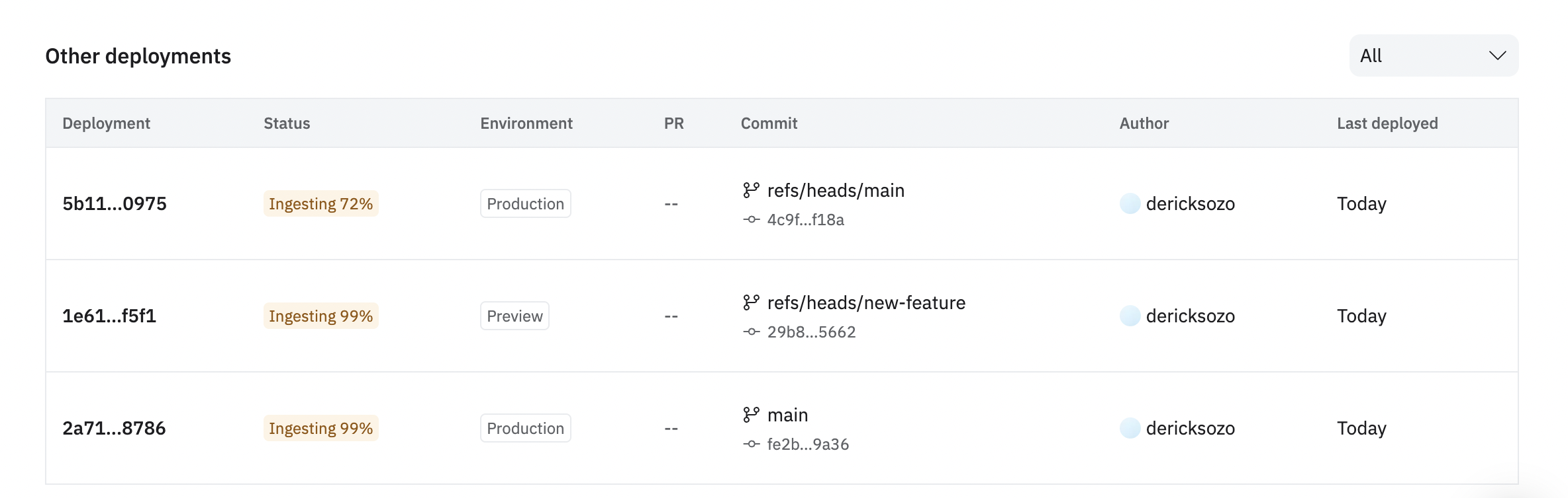 Every deployment progresses through three statuses: Building → Ingesting → Ready. This lifecycle governs when your code is compiled, when data is indexed, and what changes re-trigger historical backfill.Building